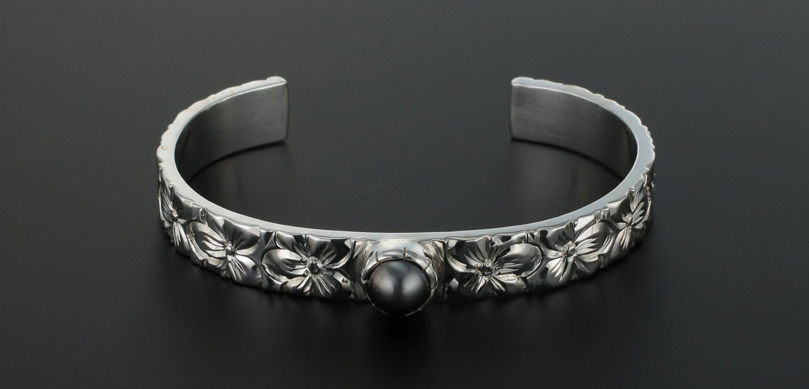 希少価値の高い鍛造(たんぞう)製法、職人が時間をかけて丁寧に作り上げたバングルは密度、強度が抜群、地金をふんだんに使っているから重厚感があり、ざっくりと深く彫られたハワイアンモチーフの煌きが違います。磨き上げにこだわった肌馴染み抜群のNUIHEREカフバングル。世界から注目される美しいタヒチ産黒真珠が、華やかな存在感を演出します。