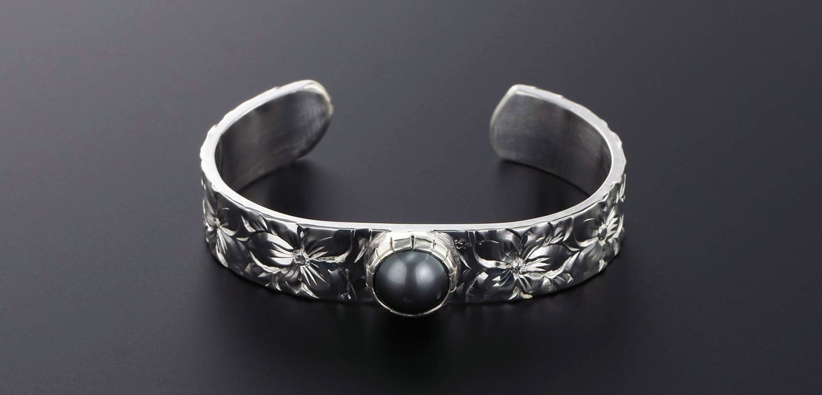 希少価値の高い鍛造(たんぞう)製法、職人が時間をかけて丁寧に作り上げたバングルは密度、強度が抜群、地金をふんだんに使っているから重厚感があり、ざっくりと深く彫られたハワイアンモチーフの煌きが違います。磨き上げにこだわった肌馴染み抜群のNUIHEREカフバングル。世界から注目される美しいタヒチ産黒真珠が、華やかな存在感を演出します。