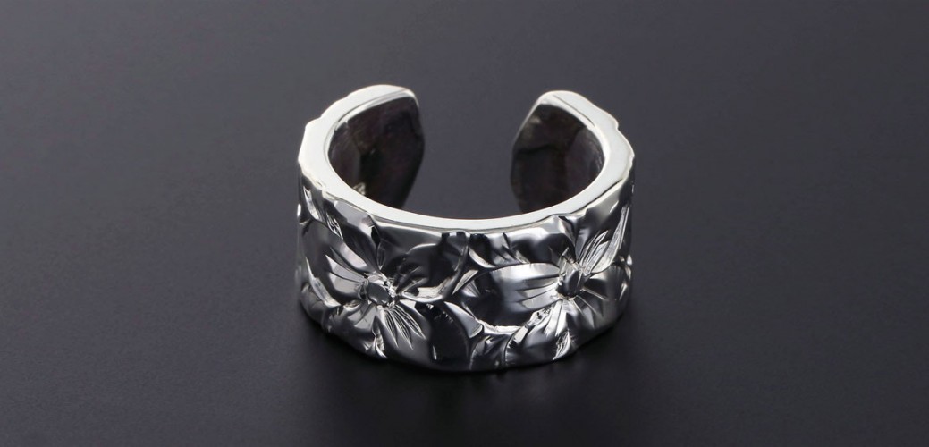 伝統的な鍛造製法で職人がフルハンドメイドで作り上げるハナウマリングはしっくりと指に馴み、華やかに指元を飾る。