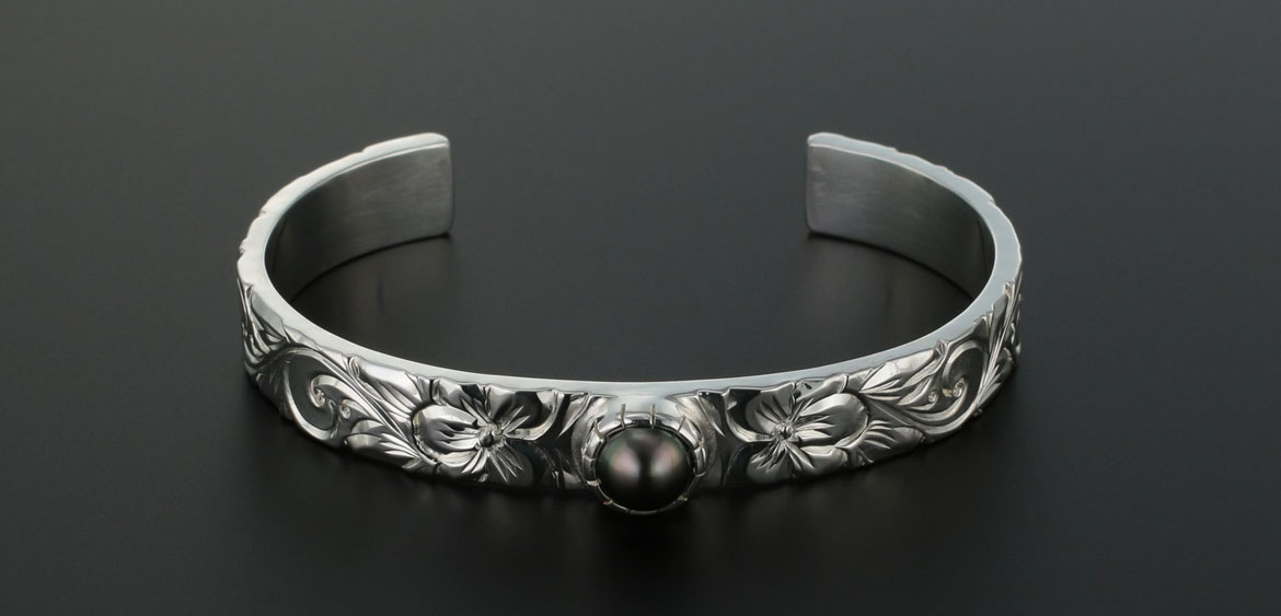 希少価値の高い鍛造(たんぞう)製法、職人が時間をかけて丁寧に作り上げたバングルは密度、強度が抜群、地金をふんだんに使っているから重厚感があり、ざっくりと深く彫られたハワイアンモチーフの煌きが違います。磨き上げにこだわった肌馴染み抜群のNUIHEREカフバングル。世界から注目される美しいタヒチ産黒真珠が、華やかな存在感を演出します。