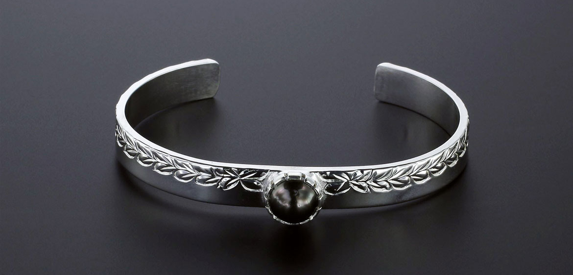 希少価値の高い鍛造(たんぞう)製法、職人が時間をかけて丁寧に作り上げたバングルは密度、強度が抜群、地金をふんだんに使っているから重厚感があり、ざっくりと深く彫られたハワイアンモチーフの煌きが違います。磨き上げにこだわった肌馴染み抜群のNUIHEREカフバングル。世界から注目される美しいタヒチ産黒真珠が、華やかな存在感を演出します。