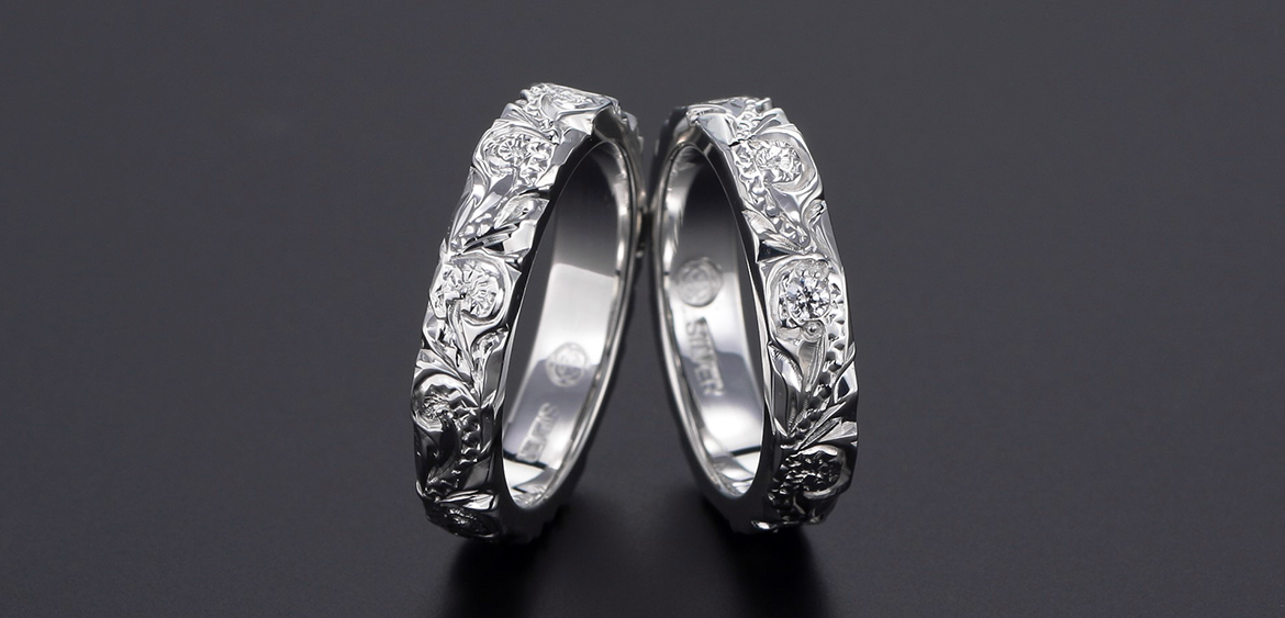 しっかりとした2mm厚の地金に手彫りで深度の高い美しいモチーフが乱反射し、まるでダイヤモンドを入れたように指元で煌きます。